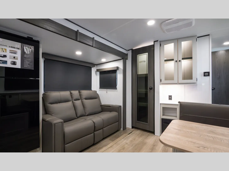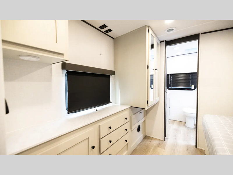 Sleeps 2 Slides 2 Length 29 ft 8 in Ext Width 8 ft Ext Height 11 ft 1 in Int Height 6 ft 11 in Hitch Weight 868 lbs GVWR 7868 lbs Dry Weight 6400 lbs Cargo Capacity 1430 lbs Fresh Water Capacity 50 gals Grey Water Capacity 70 gals Black Water Capacity 35 gals Furnace BTU 25000 btu Available Beds King Refrigerator Type 12V Refrigerator Size 10 cu ft Cooktop Burners 3 Shower Size 30" x 36" Number of Awnings 1 LP Tank Capacity 20 lbs Water Heater Type Tankless On Demand TV Info Smart TV Awning Info 18' Power w/LED Light Axle Count 2 Washer/Dryer Available Yes Number of LP Tanks 2 Shower Type Standard Similar Floorplans