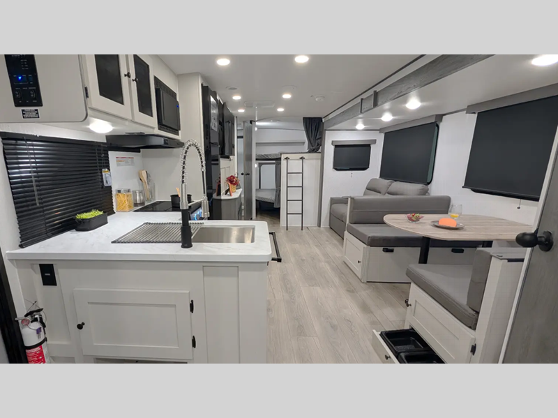Sleeps 7 Slides 1 Length 29 ft 11 in Ext Width 8 ft Ext Height 11 ft 3 in Int Height 6 ft 11 in Hitch Weight 796 lbs GVWR 7796 lbs Dry Weight 5958 lbs Cargo Capacity 1838 lbs Fresh Water Capacity 50 gals Grey Water Capacity 70 gals Black Water Capacity 35 gals Furnace BTU 25000 btu Number Of Bunks 2 Available Beds Queen Refrigerator Type 12V Refrigerator Size 10 cu ft Cooktop Burners 3 Shower Size 24" x 36" Number of Awnings 1 LP Tank Capacity 20 lbs Water Heater Type On Demand Tankless Awning Info Power w/LED Light Axle Count 2 Number of LP Tanks 2 Shower Type Standard Similar Floorplans