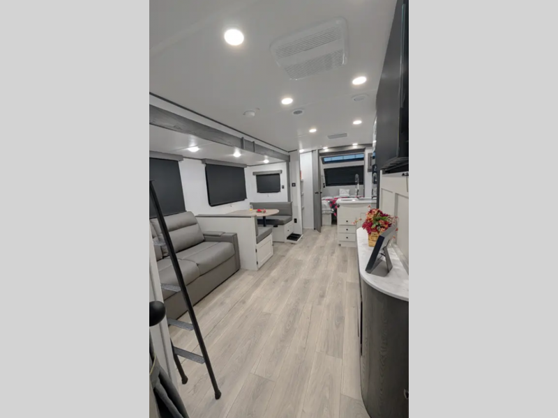Sleeps 8 Slides 1 Length 34 ft Ext Width 8 ft Ext Height 11 ft 2 in Int Height 6 ft 11 in Hitch Weight 982 lbs GVWR 9000 lbs Dry Weight 6856 lbs Cargo Capacity 2144 lbs Fresh Water Capacity 50 gals Grey Water Capacity 35 gals Black Water Capacity 35 gals Furnace BTU 25000 btu Number Of Bunks 2 Available Beds Queen Refrigerator Type 12V Refrigerator Size 10 cu ft Cooktop Burners 3 Number of Awnings 1 LP Tank Capacity 20 lbs Water Heater Type Tankless On Demand TV Info Smart TV Awning Info 18' Power with LED Light Axle Count 2 Number of LP Tanks 2 Shower Type Standard Similar Floorplans